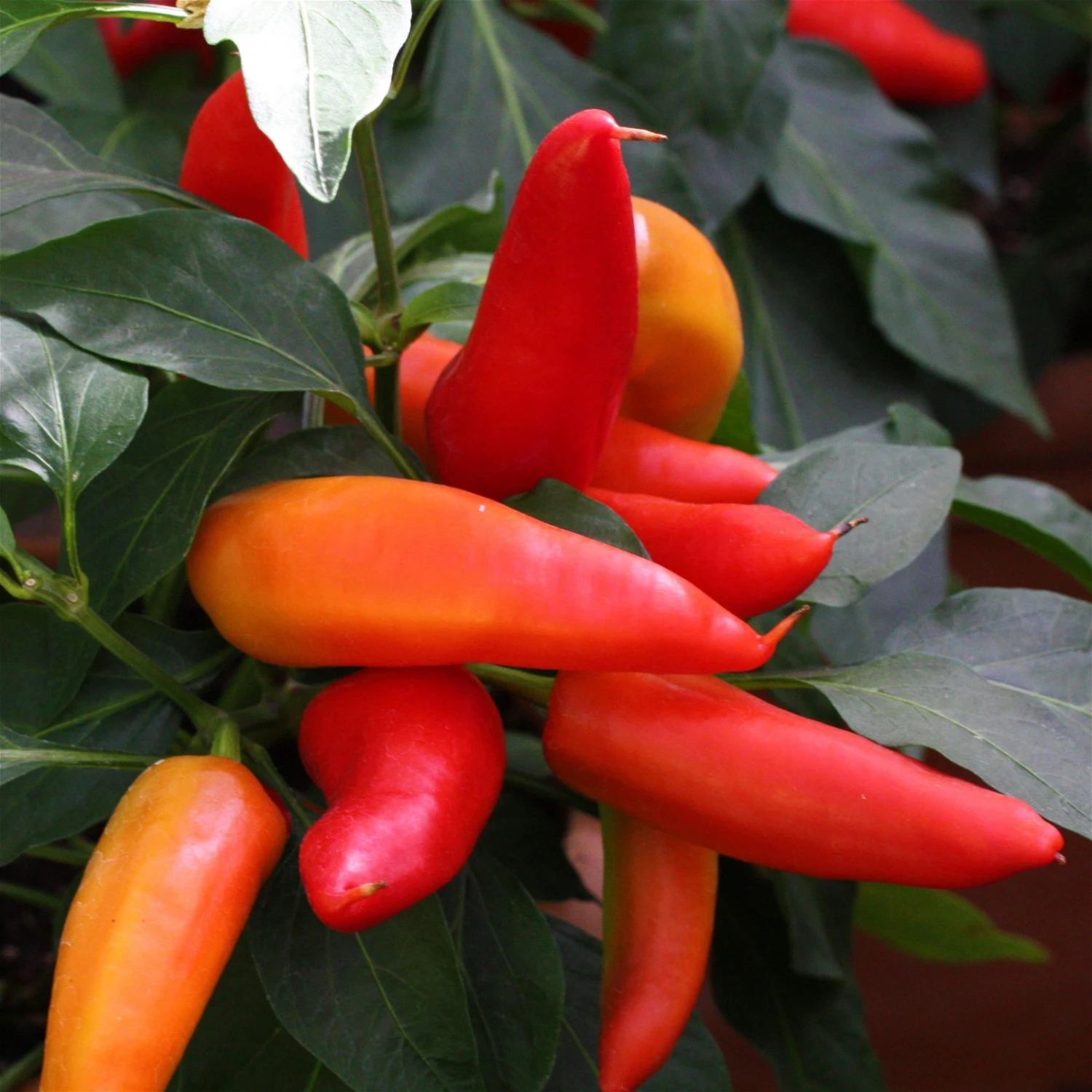 Die Snack-Chili (Capsicum annuum) hat glatte, lanzettliche, dunkelgrüne Blätter. Die Pflanze wächst buschig und kann eine Wuchshöhe von 40 – 60 cm erreichen.