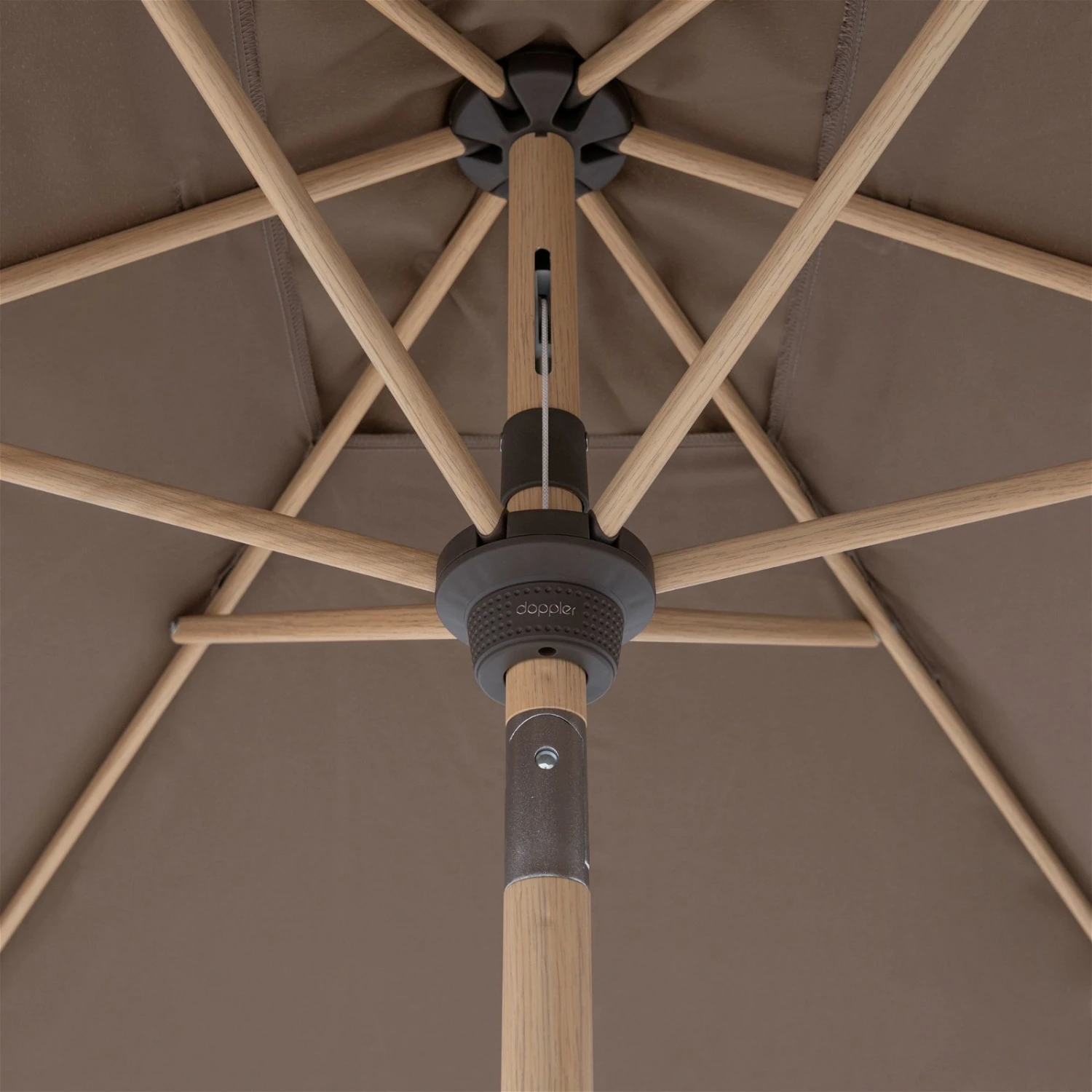 Dieser Sonnenschirm schützt Sie den ganzen langen Sommertag vor glühender Hitze und gefährlicher UV-Strahlung. Der moderne Kurbelschirm ‚Alu-Wood Ultra‘ verfügt über eine innovative Auto-Tilt-Funktion: Indem Sie die Kurbel drehen, öffnen Sie zunächst den Schirm und stellen anschließend den gewünschten Neigungswinkel ein.