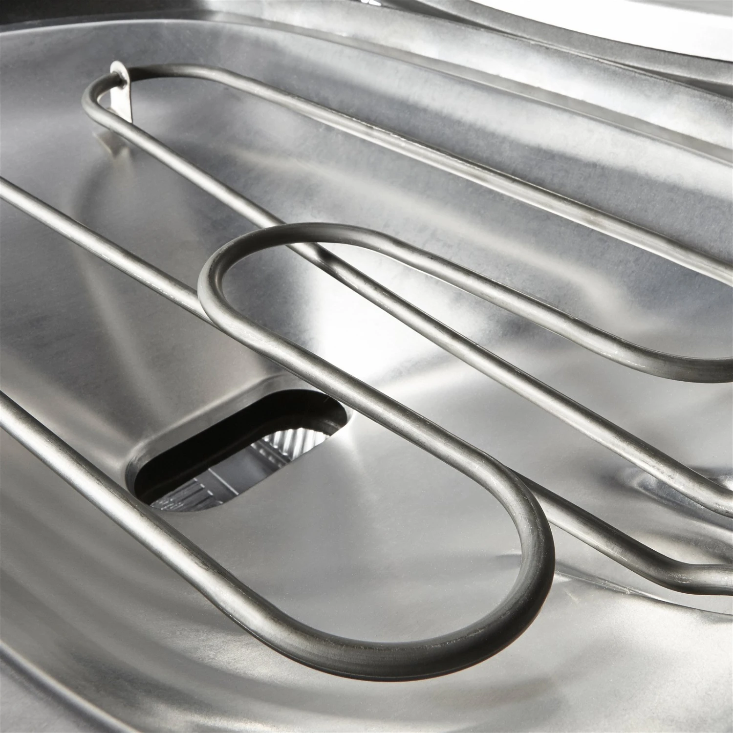 Deckel und Gehäuse aus Aluguss, massiver, zweigeteilter Grillrost aus porzellanemailliertem Gusseisen, große, selbstreinigende Heizspirale, 2.200 Watt, stufenlos verstellbarer Temperaturregler, abnehmbare Fettauffangschale, Glasfaserverstärkter Nylonrahmen, Grillfläche ca. 54 x 39 cm
