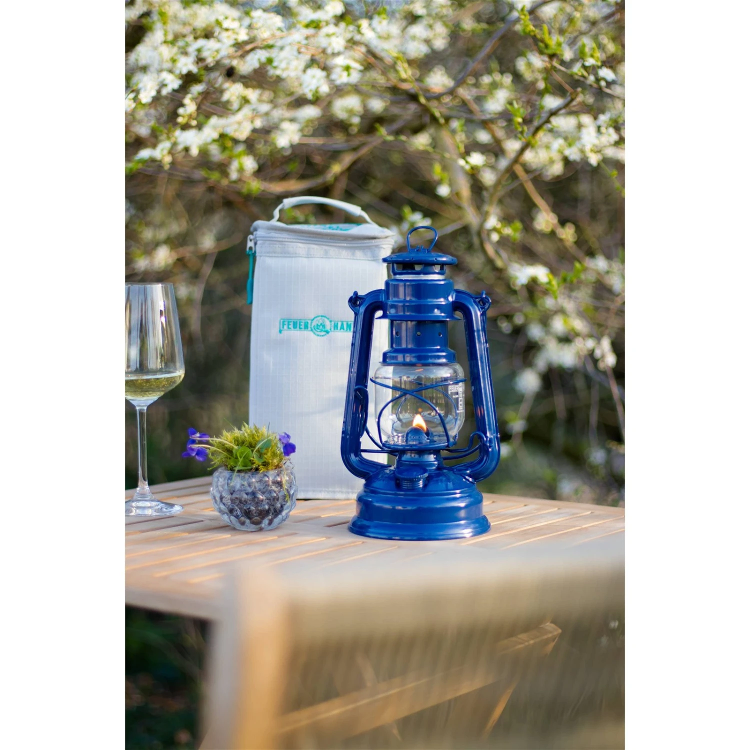 Ob es regnet, stürmt oder schneit – die Sturmlaterne ‚Baby Special 267‘ von Feuerhand in Kobaltblau spendet unbeirrt ein warmes, lebendiges Licht. Dieser Klassiker der Outdoorbeleuchtung überzeugt durch seinen sparsamen Energieverbrauch, sodass eine Tankfüllung mit Petroleum oder Lampenöl für rund 20 Stunden Brenndauer reicht.