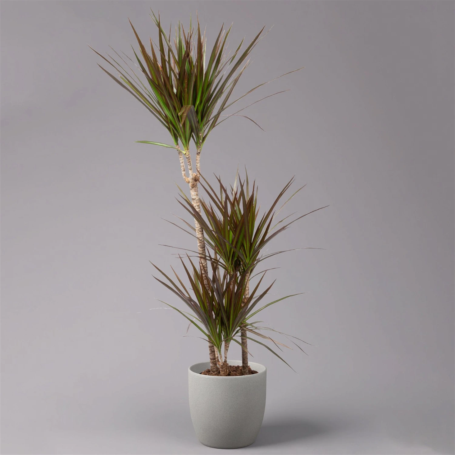 Dank ihrer lanzettlichen Blätter mit filigraner Zeichnung in Rot und Grün ist die Dracaena marginata ‚Magenta‘ ein beeindruckendes Element der Raumbegrünung mit exotischem Touch. Dieses Spargelgewächs macht sich in einem Wohnzimmer oder Büro gleich gut und verbessert nachweislich das gesamte Raumklima. Zum einen synthetisieren Drachenbäume erhebliche Mengen an Sauerstoff, zum anderen filtern diese erstaunlichen Pflanzen solche unerwünschten Substanzen wie Benzol und Formaldehyd aus der Luft heraus. Um optimale Wachstumsbedingungen für Ihre Dracaena ‚Magenta‘ zu schaffen, suchen Sie für Ihren Drachenbaum einen halbschattigen und nicht zu kalten Standort aus und gießen Sie die Pflanze sparsam. Lassen Sie das Substrat zwischen den Wassergaben gründlich antrocknen, gönnen Sie den Drachenbaum aber immer wieder ein wohltuendes Sprühbad.