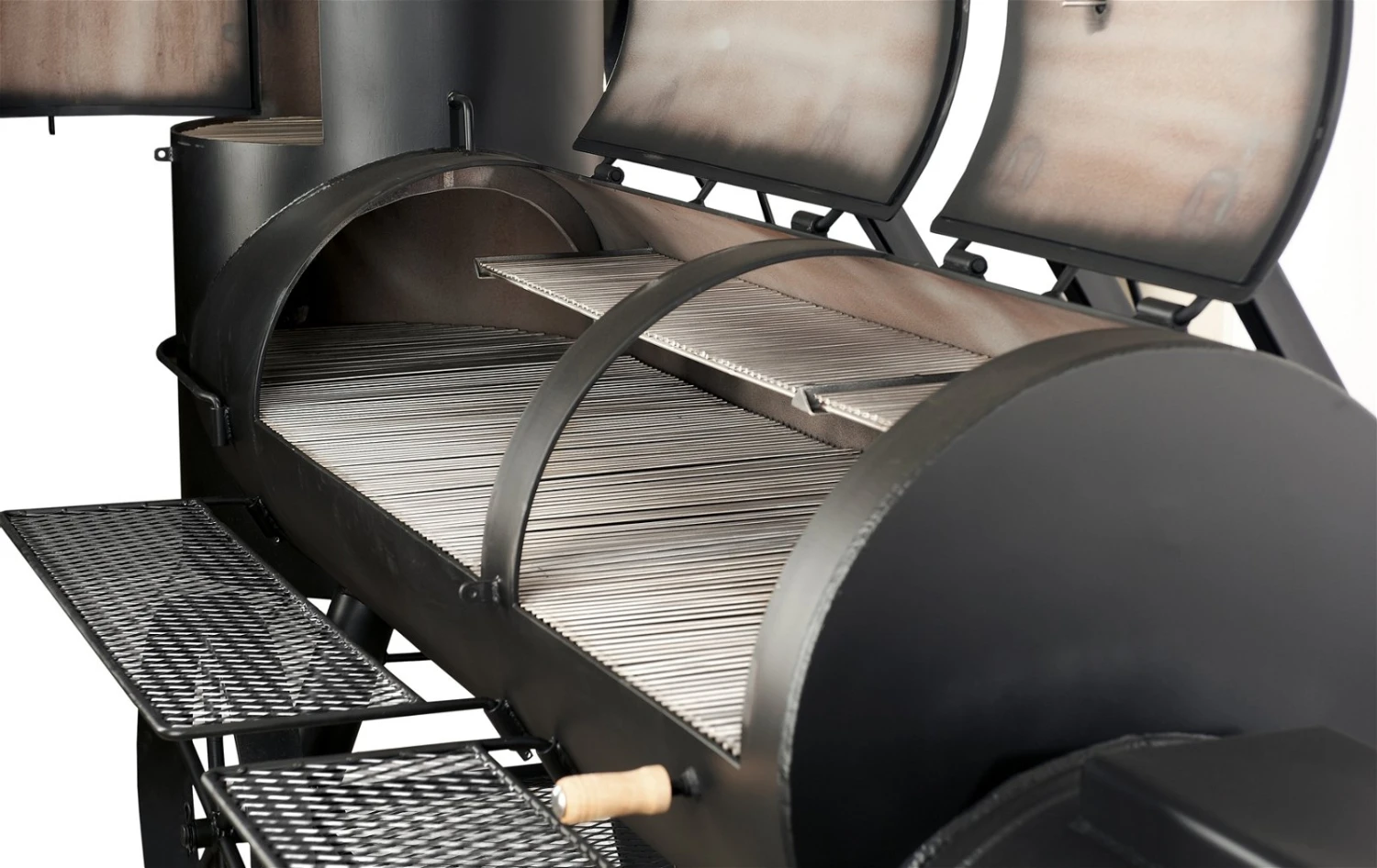 Mit dem Joe’s Barbeque Smoker 24″ Extended Catering entscheiden Sie sich für die XXL Version des Joe’s Barbeque Smoker 24″. In sorgfältiger Handarbeit hergestellt, besteht dieser Smoker aus massivem Stahlrohr mit der original Wandstärke von 6,35 mm, Edelstahlrosten mit 6 mm starken Stäben und einem massiven Feuerboxrost mit 16 mm Stabstärke. Eine doppelte Garkammertür, ein Catering-Einsatz, Hitzeverteilungssystem, Grilling Box sowie eine zweite dritte Rostebene in der Räucherkammer komplettieren den Joe’s Barbeque Smoker 24″ Extended Catering.
