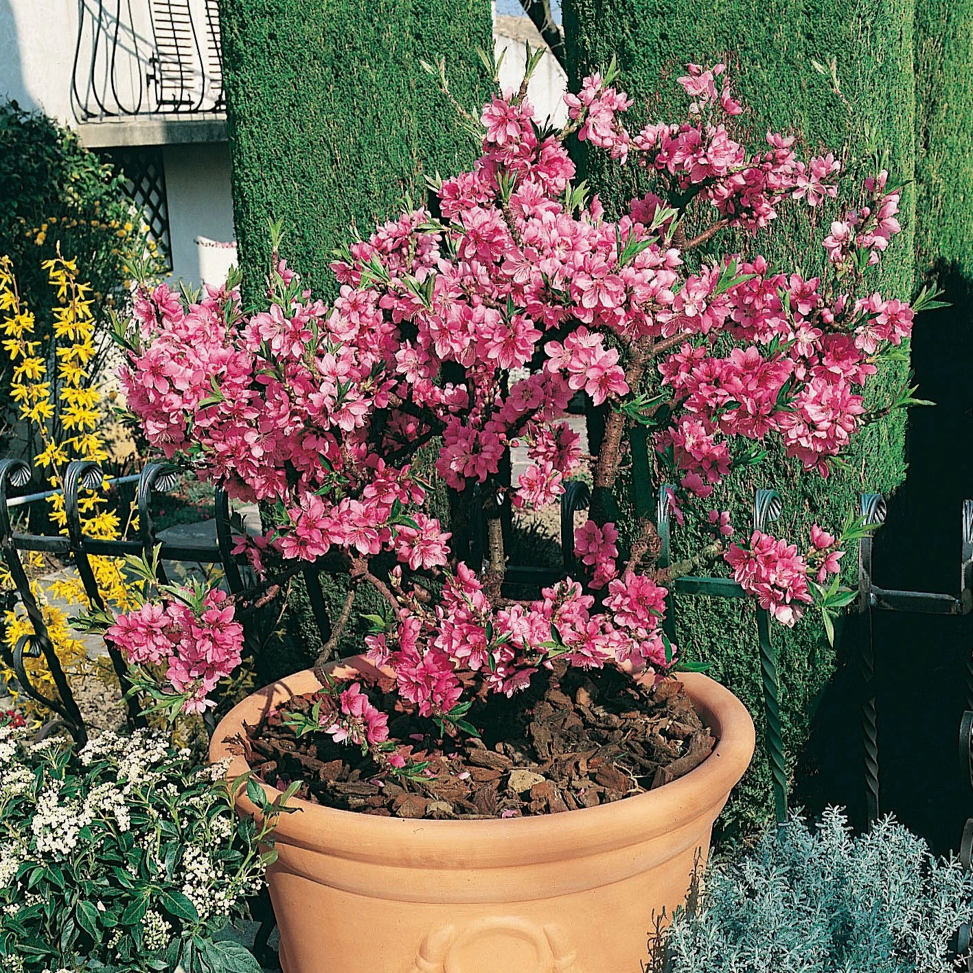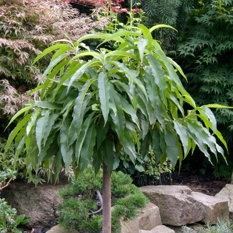 Ein Muss für jeden Naschgarten ist der Zwergpfirsich ‚Diamond’®ZaipeviⓈ. Von diesem kompakt wachsenden Kleinbaum können Sie Ende Juli/Anfang August rot-gelbe, saftige Früchte mit weißem Fruchtfleisch und süßem Geschmack ernten. Bevor die Ernte beginnt, zeigen sich im März und April dekorative, rosafarbene Blüten an diesem Zwergpfirsich.