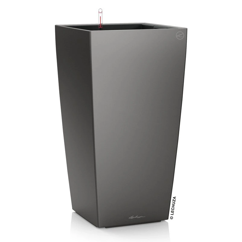 Dieses All-in-One-Set besteht aus einem Lechuza Pflanzgefäß Cubico Premium 30 in anthrazit-metaillic, einem Pflanzeinsatz, Granulat für die Drainageschicht sowie einem Wasserstandsanzeiger.