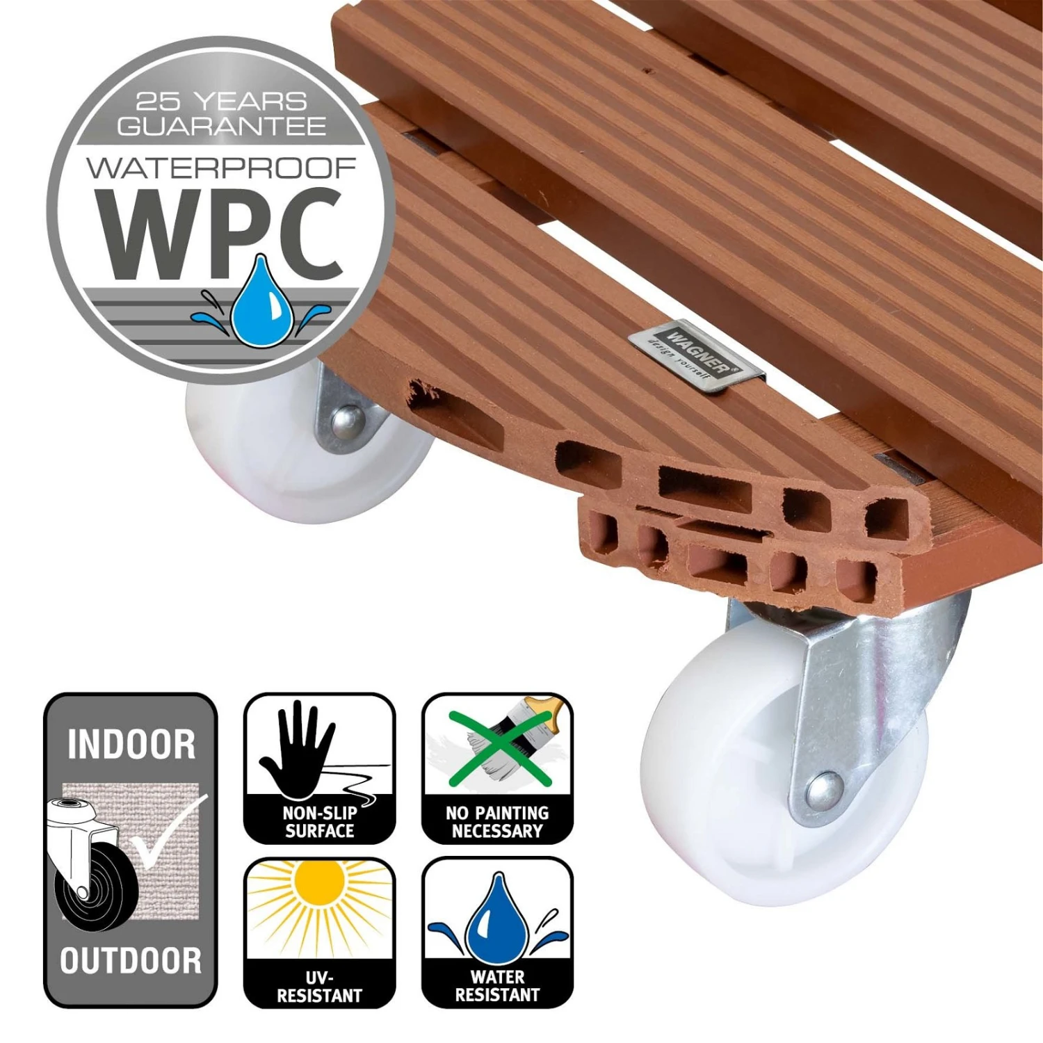Die Tragfläche des Multi Rollers WPC ist aus dem Wood-Plastic-Composite gefertigt. Dieser innovative Verbundwerkstoff ist nicht nur hochbelastbar, sondern auch wasserabweisend und beständig gegenüber der UV-Strahlung. Außerdem splittert das WPC nicht, was für höhere Sicherheit im Umgang mit dem Pflanzenroller sorgt.