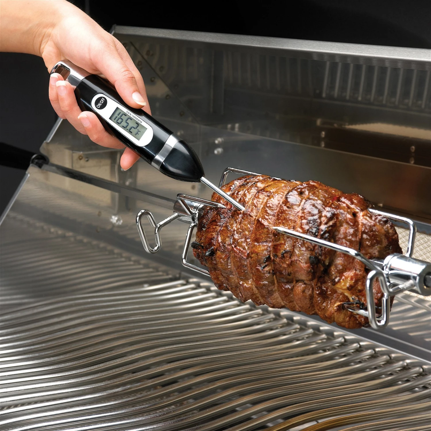 Das Napoleon Gourmet Grills Digital Thermometer zeigt Ihnen schnell, zuverlässig und präzise die Kerntemperatur im Grillgut an. Prüfen Sie Fleisch- und Fischgerichte und behalten den Gargrad des Grillguts immer im Auge. Unkompliziert in der Bedienung, reinigen Sie das Digital Thermometer mit etwas Seife und Wasser.