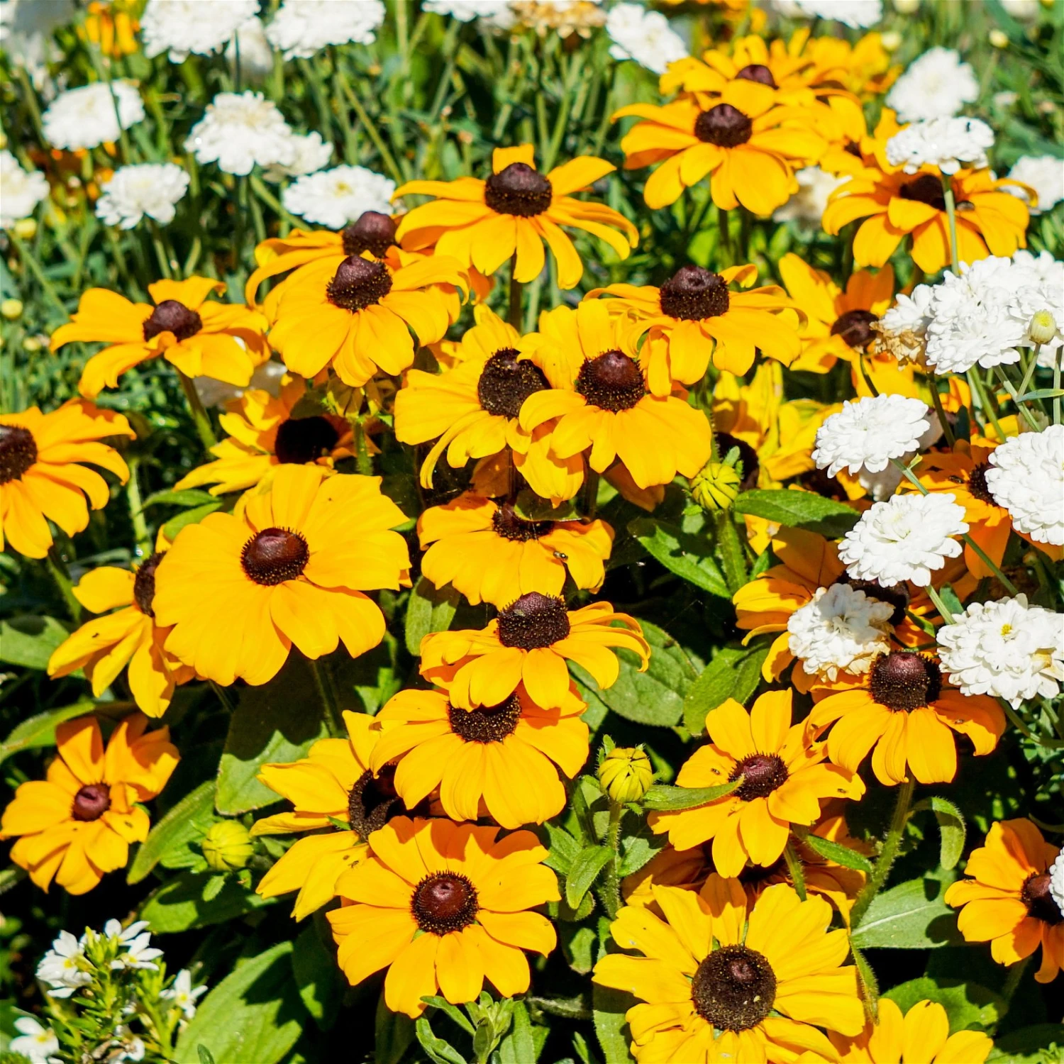 Pflanzen Sie Ihre harmonische Pflanzenmischung in nährstoffreiche, durchlässige Blumenerde an einem sonnigen bis halbschattigen Standort. Entfernen Sie abgeblühte Blüten des gelben Sonnenhuts regelmäßig, um die Knospenbildung anzuregen.