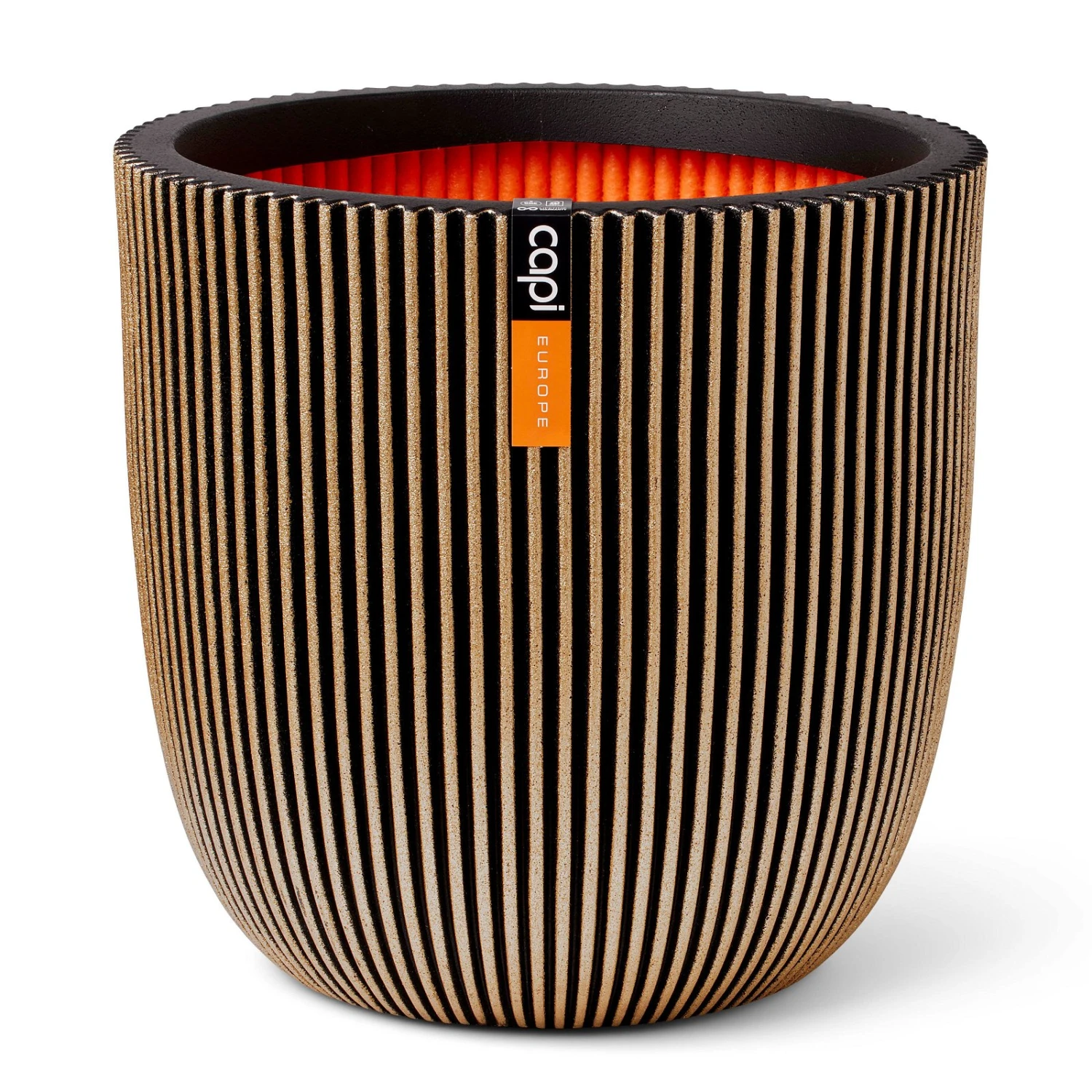 Das Pflanzgefäß ‚Groove‘ besticht mit dekorativer Oberflächenstruktur und einem schicken Kontrast zwischen Gold und Orange. Dieser Pflanztopf von Capi Europe besteht aus recyceltem Kunststoff, ist bruchsicher, UV- und frostfest sowie ein richtiges Leichtgewicht. Wenn Sie das wasserdichte Pflanzgefäß ‚Groove‘ draußen verwenden möchten, bohren Sie ein Ablaufloch in den Boden.