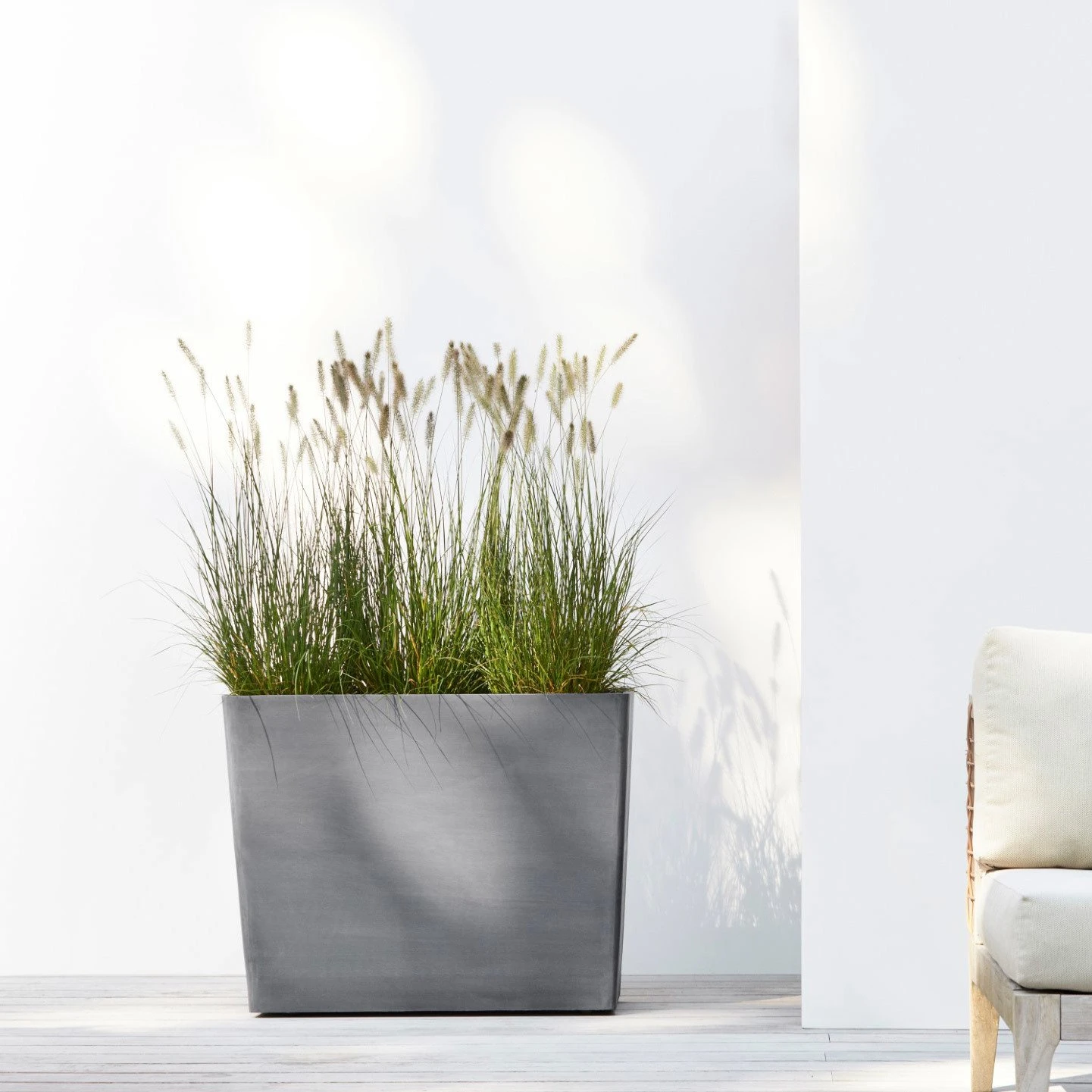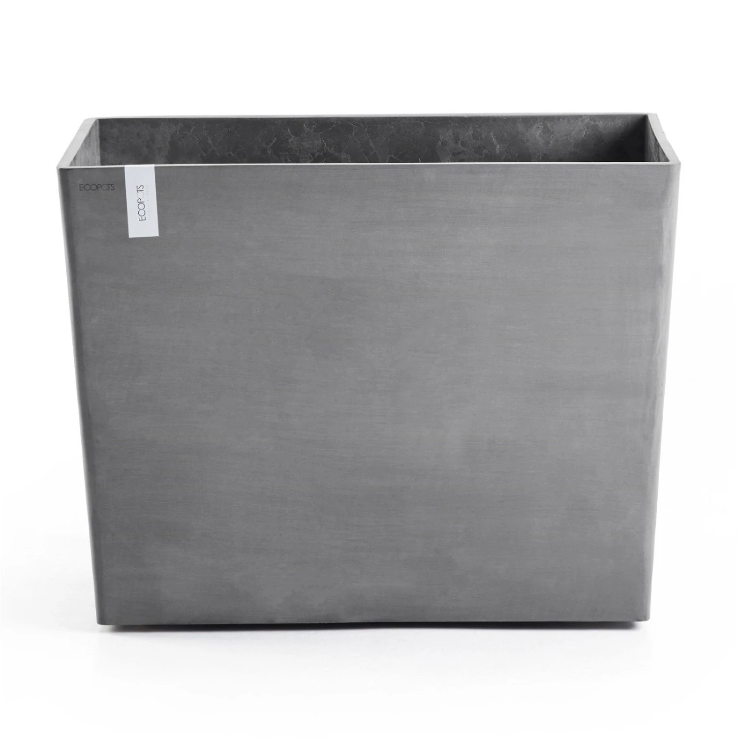 Dieser Pflanzkasten in angesagter Betonoptik besteht aus UV-resistentem, frost- und bruchsicherem Recyclingmaterial. Der graue Pflanzentrog ‚Paris‘ von Ecopots überzeugt durch seine moderne, klare Linienführung und imposante Maße. Dabei verleihen die integrierten Rollen dem Pflanzgefäß ein Plus an Mobilität.