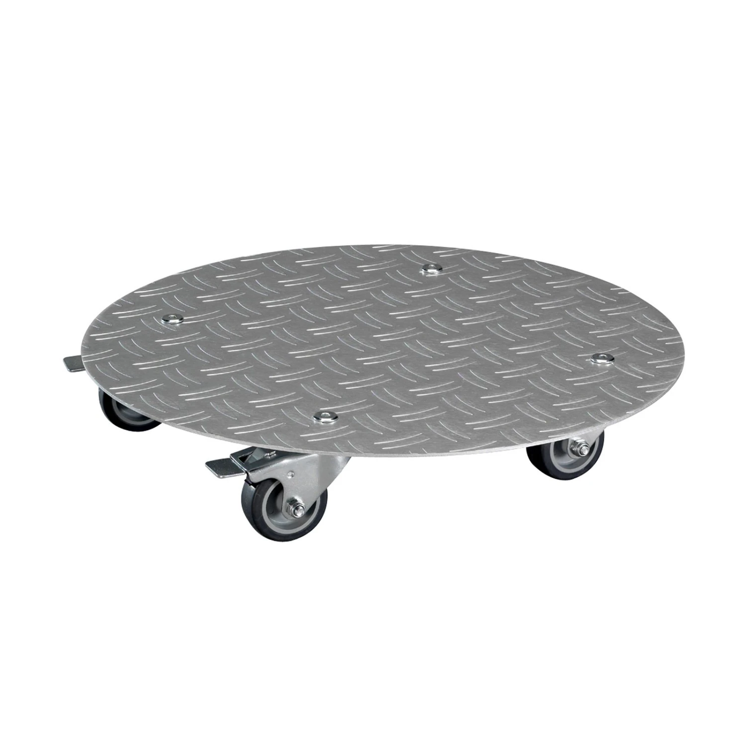 Dieser wasserabweisende Pflanzenroller besteht aus grauem Alu Riffelblech und hat einen Durchmesser von etwa 38 cm. Durch die geriffelte Oberfläche verrutschen die Pflanzgefäße beim Bewegen nicht und können sicher transportiert werden. Vier Rollen, von denen zwei mit starken Feststellbremsen ausgestattet sind, sorgen für einen guten Lauf auf beinahe allen Bodenbelägen.