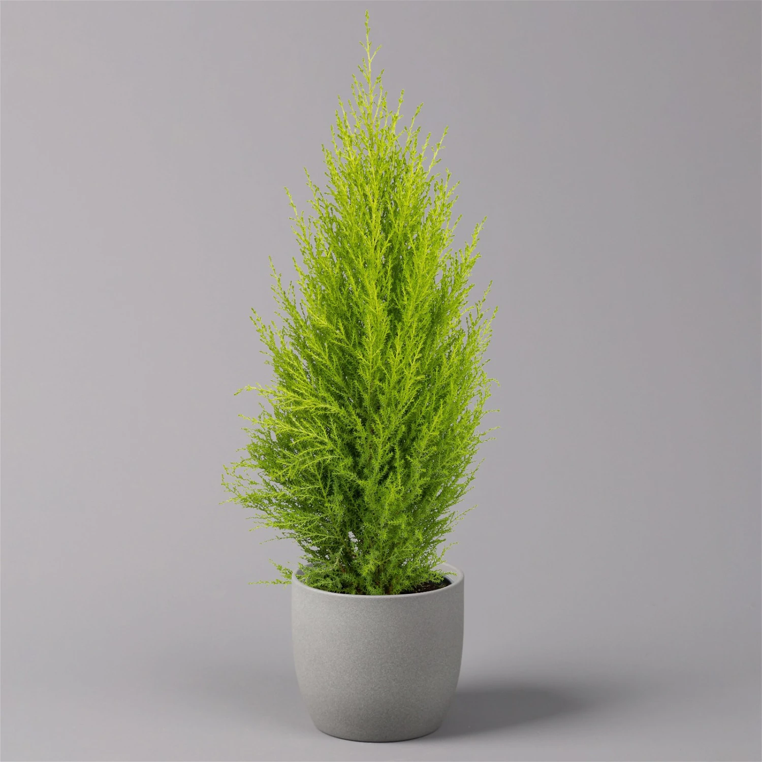 Die Zimmerzypresse (Cupressus macrocarpa ‚Goldcrest Wilma‘), auch unter dem Namen Monterey-Zypresse bekannt, ist eine Zypressenart aus dem amerikanischen Kalifornien. Das Gehölz kommt dort natürlicherweise in Küstenregionen vor und gedeiht als imposanter Baum mit teilweise bizarrem Wuchs. Charakteristisch sind die schuppenartigen Nadelblätter, die bei der Sorte ‚Goldcrest Wilma‘ in intensivem Gelbgrün strahlen. Bei der Kultur in unseren Regionen wächst die Zypresse typisch ihrer Art säulenartig bis kegelförmig und elegant aufrecht.